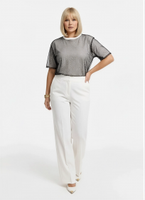 Свитшот свободного прямого силуэта выполнен из однотонной легкой ткани молочного цвета. Круглый вырез горловины, длинные рукава с небольшими декоративными воланами по плечевому шву. Нижний край и манжеты рукавов оформлены эластичной отделкой. Модель без застежек и карманов, боковые швы прямые без разрезов